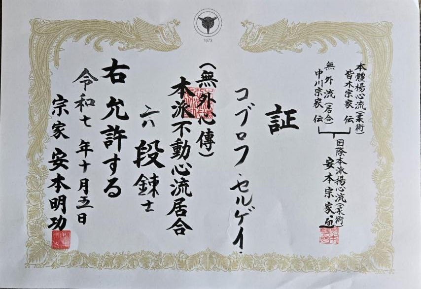 | 6 дан Мото-Ха Мугай-Рю Фудошин Иай | Соке Ясумото Акиеши | 5 октября 2025г. На международном Тайкай г.Йонаго, Япония. |