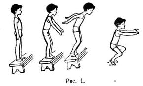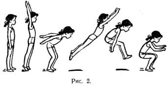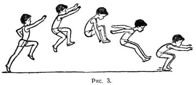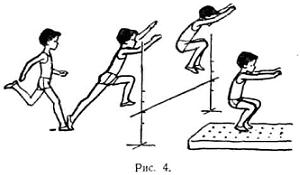 Для детей дошкольного возраста доступны наиболее простые виды прыжков: подпрыгивания на месте, с продвижением, спрыгивания с высоты (рис. 1), прыжки в длину с места (рис. 2) и с разбега (рис. 3), прыжки в высоту с места и с прямого разбега (рис. 4).